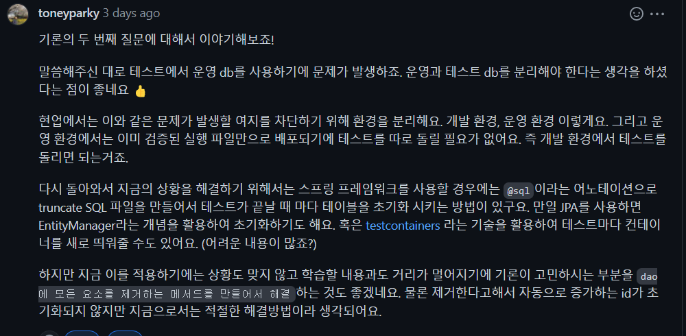 와 같이 다양한 방법들이 있었다. 이번 미션에서는 우선 테스트가 끝날 때마다 테스트할 때 생성했던 데이터를 날려줬다.