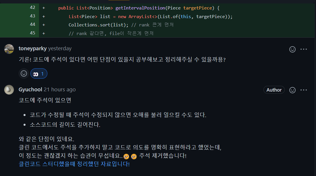 주석을 적었다는 것은 그만큼 코드가 한 번에 읽히지 않는다는 뜻이다. 코드는 신문기사 읽듯이 읽혀야 하는데 말이다.