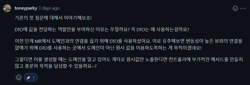 DTO로 변환할 때는 어쩔수없이 내부 값을 보내야 하므로 디미터의 법칙이 어길 수밖에 없다고 한다.