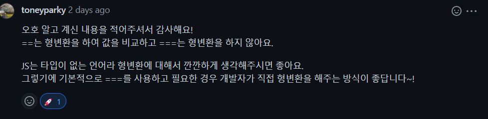 따라서 아래의 토니의 말씀처럼 ===을 주로 사용해서 비교해주자!(지금까지 ==을 주로 사용해왔다..)
