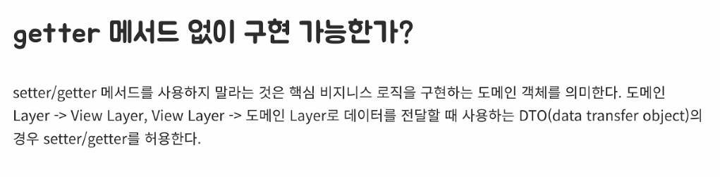 domain에서 dto로 변환을 위한 getter는 허용이다. 비즈니스 로직을 구현할때 getter/setter를 사용하지 말자는 뜻 이다.