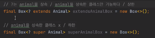 상한에서 new Box<>(new Dog()); 와 같이 사용이 가능하다 하지만 new Box<>(new Object())는 안된다.