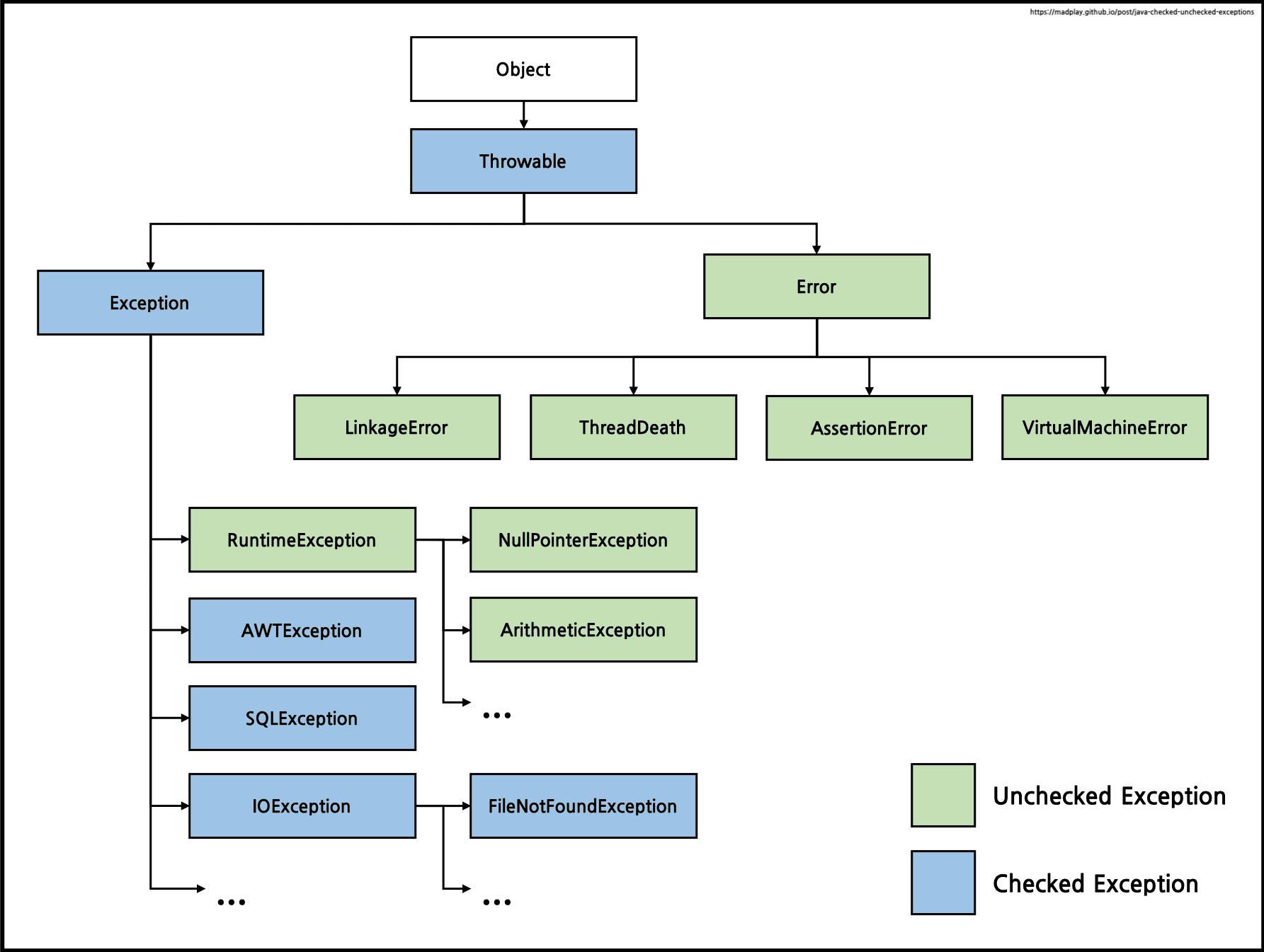 - checked Exception은 RuntimeException의 하위 클래스가 아니면서 Exception 클래스의 하위 클래스들이다.
