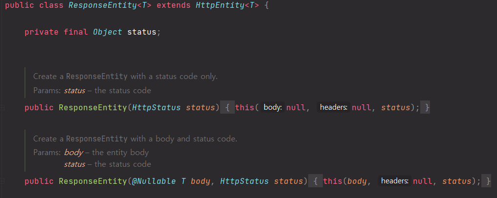 ResponseEntity내부를 보면 아래와 같이 HttpEntity를 상속받았습니다.