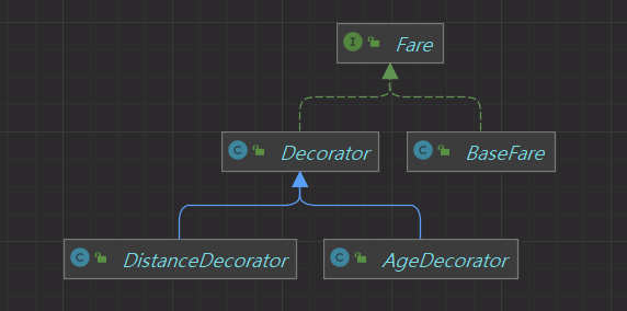 위와 같이 요금을 측정하는데, 나이와 거리에 따라 요금을 측정한다고 하자. 이때 나이와 거리의 조합에 따라서 요금이 결정된다고 생각했고 데코레이터 패턴을 적용해봤다.