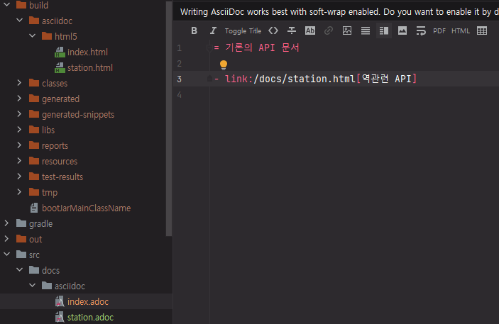 그런 후 src/docs/asciidoc와 같이 디렉토리를 만들고 *.adoc파일을 작성해줍니다.