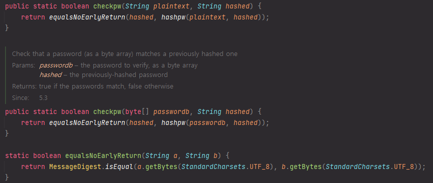 checkpw()를 보면 해싱된 비밀번호를 바이트화 시키고, 평문과 해싱된 비밀번호를 salt로 하여금 다시 해싱 처리를 한 후, 바이트화 시켜서 비교한다.