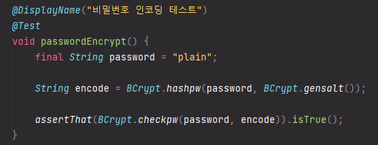 위 간단한 예시처럼 Bcrypt.hashpw()에 평문 패스워드와 BCrypt에서 제공해주는 솔트를 넣어서 암호화해주면, checkpw() 메서드를 통해서 간단하게 확인할 수 있다.