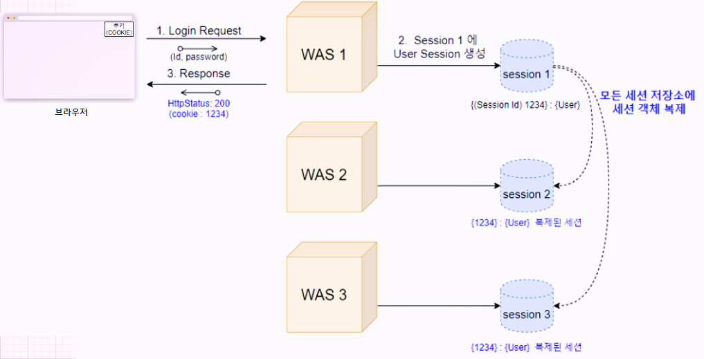 - 세션을 복제하여 전달 중에 전달되지 않는 곳으로 요청이 들어오면 로그인에 실패한다.