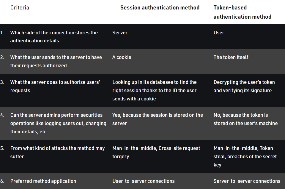 주요 차이점은 세션 기반 인증은 서버가 세부 사항을 저장하고, 반면에 토큰 기반은 클라이언트가 토큰을 가지고 있는 형태이다. 두 방법 모두 취약점이 있고, 자신의 요구와 응용 프로그램에 더 적합한 방법을 결정해야 한다. 토큰은 대역폭이 크기 때문에 저장해서 사용하는 것보단 대역폭이 작은 세션을 사용하는 게 좋을 것 같다.