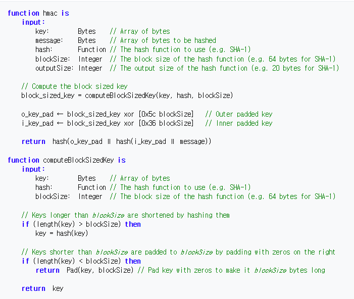 - 이제 구한 i_key_pad 값에 전송할 message 를 concatenation 한 후에 hash 를 돌리고 나온 값을 o_key_pad 에 concatenation 한후에 다시 hash 를 한 값이 HMAC 이 됩니다.
