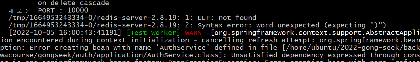 그런데...! 자꾸 젠킨스에서 빌드가 실패한다. 원인을 보면 테스트에서 실패가 일어나는데 아래와 같은 로그가 계속 나온다.