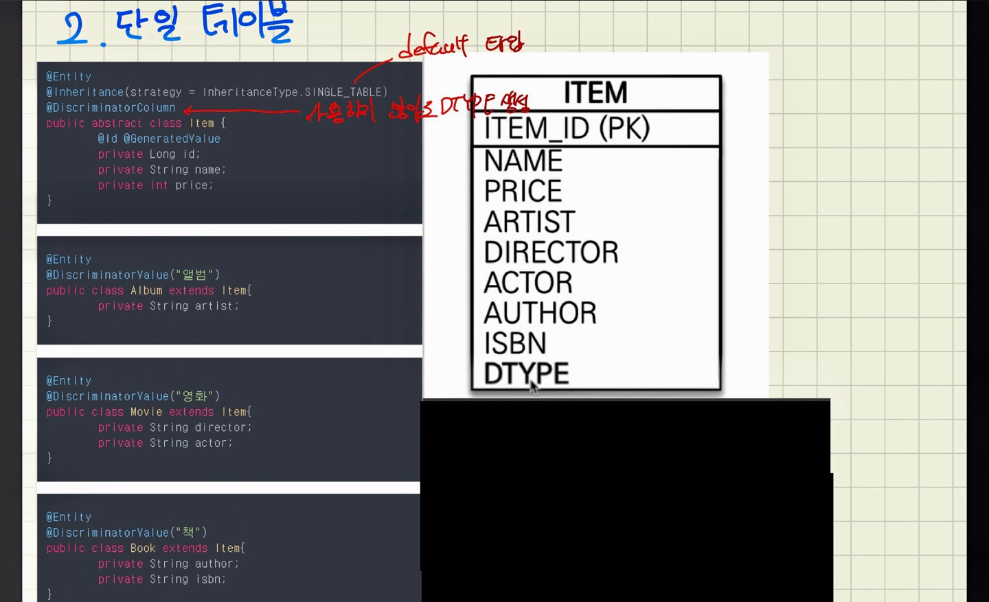 한 테이블에 다 저장하고, DTYPE으로 구분하는 단일 테이블 전략을 선택할 수 있다.