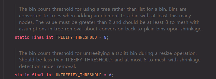 해시 충돌이 발생해서 링크드 리스트가 8개 이상이 되는 순간 링크드 리스트가 Tree형태로 변환이 됩니다. 이때 사용되는 트리는 RBTree라고 합니다. RedBlackTree는 최악의 경우도 O(logn)으로 유지할 수 있는 트리입니다. 따라서 충돌 데이터가 너무 많다면 트리 형태로 변환해서 탐색 속도를 높인 것입니다. 마찬가지로 6개가 되면 다시 리스트 형태로 변환됩니다. 2의 차이를 둔 이유는 -,+반복으로 매번 자료구조가 변하면 비용이 들기 때문에 차이를 2로 두었다고 합니다.