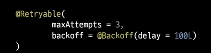 단순하게 아래의 사진처럼 @Retry(3번 시도하고, 간격마다 100ms 시간을 delay 함)로 해결할 수 있다.