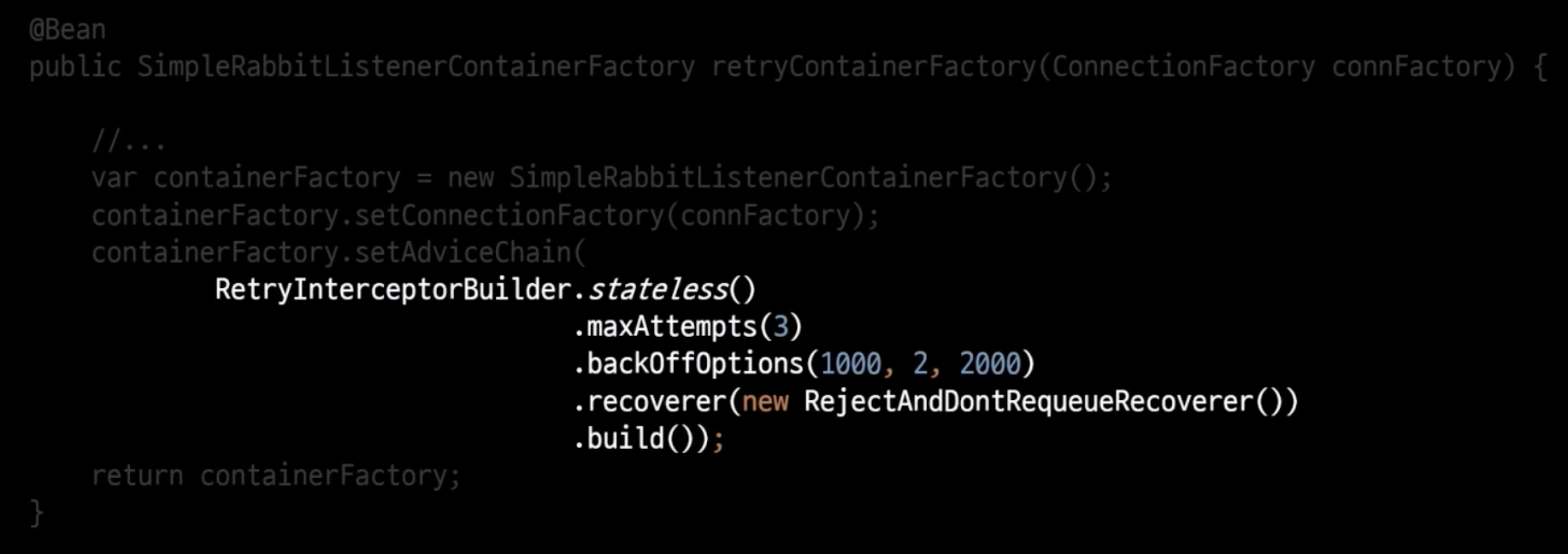 - 예외가 발생한 경우에도 메시지를 수동으로 NACK로 표시하여 다시 큐로 반환하거나, 재처리를 요청하도록 커스텀할 수 있다.