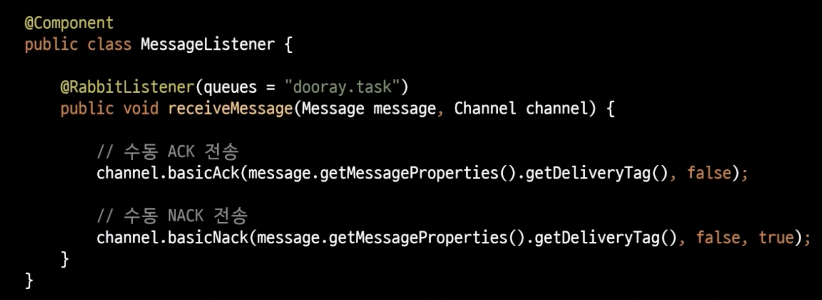 - 메시지 처리 시간이 긴 작업을 수행할 때는 바로 ACK를 보내기 전에 메시지를 처리하고 완료 여부에 따라 ACK 또는 NACK를 전송할 수 있다.