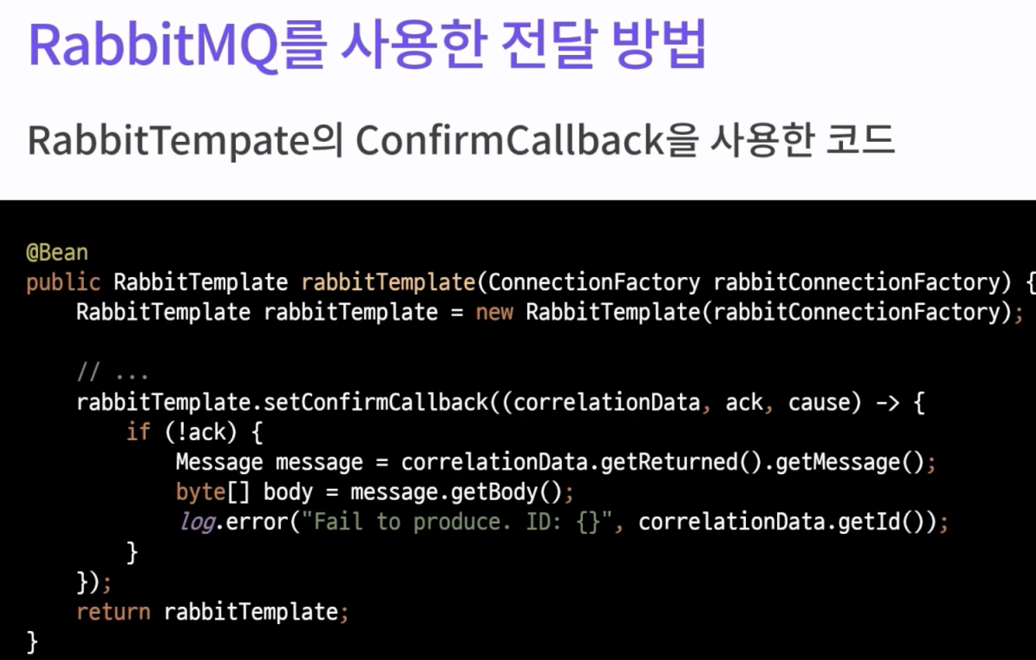 메시지를 발행 시점에, CorrelationData에 UUID를 넣으면 메시지 확인 가능하다. 콜백을 받는 방법은 아래와 같다.