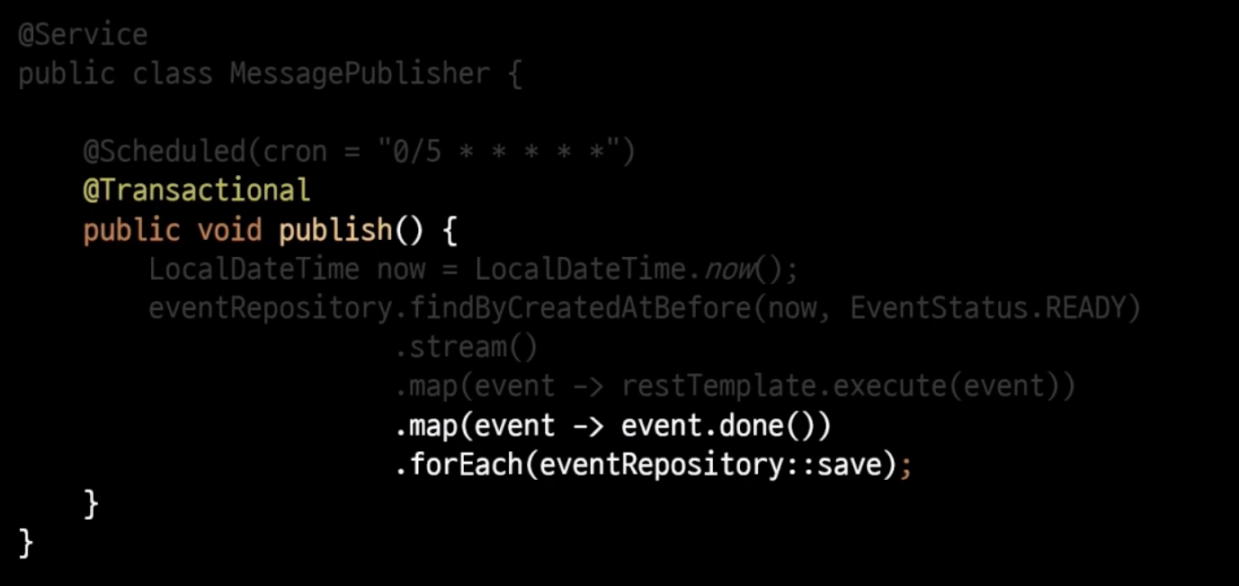 여기서 outbox디비의 역할을 eventRepository가 한다고 생각하면 된다. 여기서 @Transactional로 묶여있으므로 task가 만약 실패하더라도 outbox에 event가 저장되지 않고 롤백되므로 원자성을 보장한다.