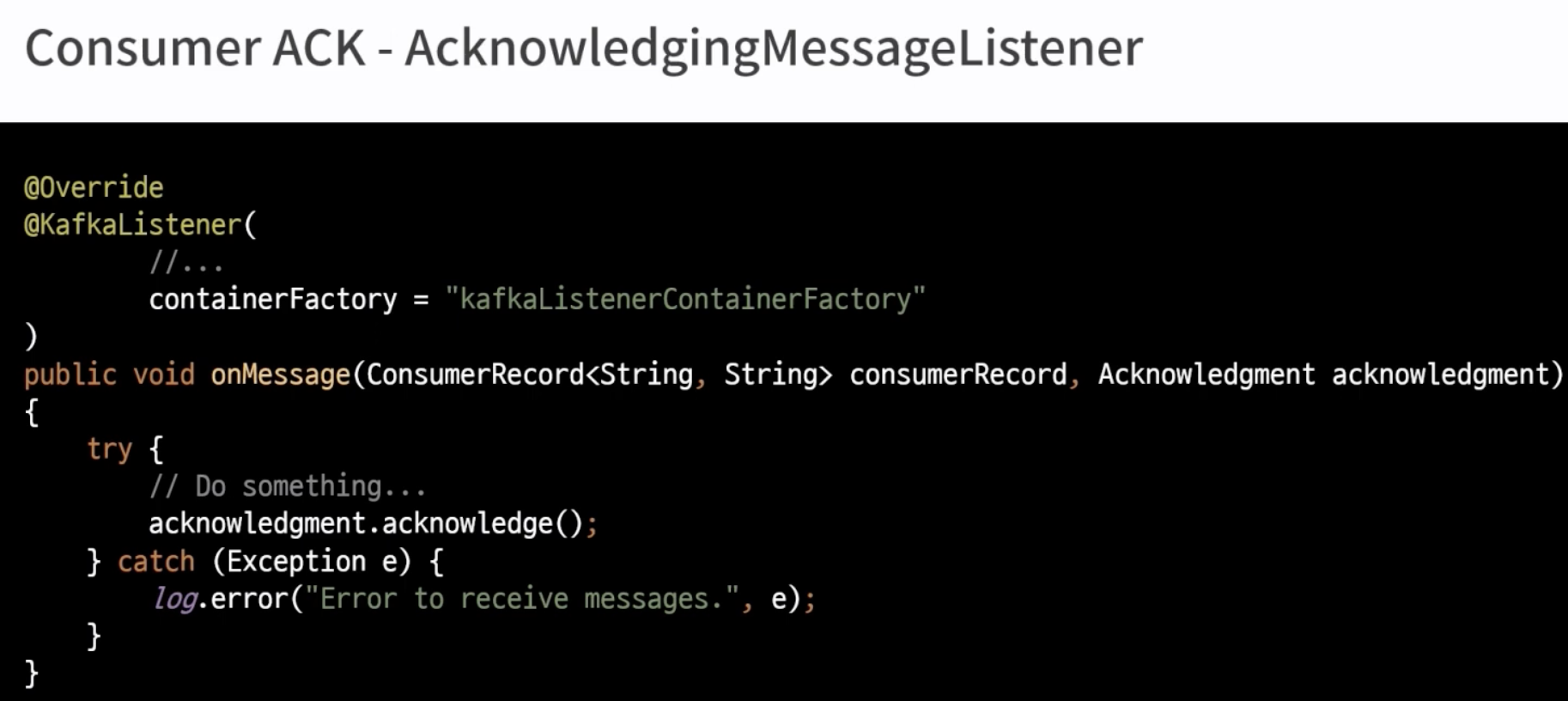 2번째 인자로 받은 acknowledgment.acknowledge()를 호출하면 성공한 Consumer ACK이 나간다. 아래의 설정값도 반드시 필요하다.