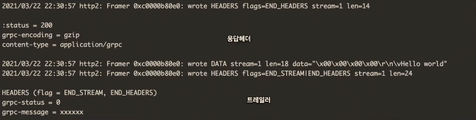 응답 메시지는 응답 헤더, length prefixed Message, Trailer 3가지이다.