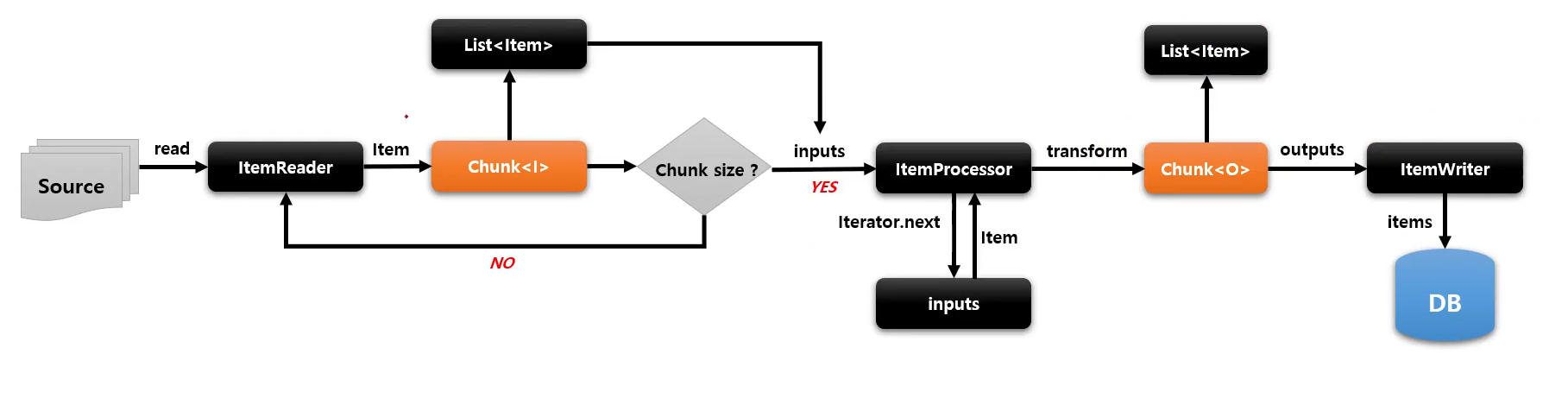 - IteamReader, ItemProcessor는 Chunk내 개별 아이템을 처리한다. ItemWriter는 Chunk크기만큼 일괄 처리한다.