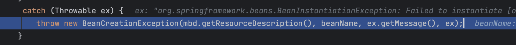 위처럼 job param을 통해서 chunk size를 런타임에 주입하면 null이 들어왔다고 에러가 나온다. 실제 디버깅을 해보면 아래의 BeanCreateionException 에러 메시지가 나온다.