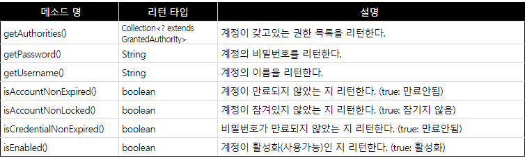 UserDetailsService 인터페이스는 DB에서 유저 정보를 가져오는 역할을 한다. 해당 인터페이스의 메소드에서 DB의 유저 정보를 가져와서 AuthenticationProvider 인터페이스로 유저 정보를 리턴하면, 그 곳
