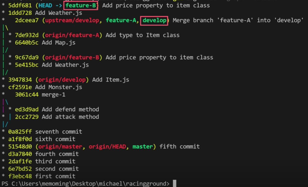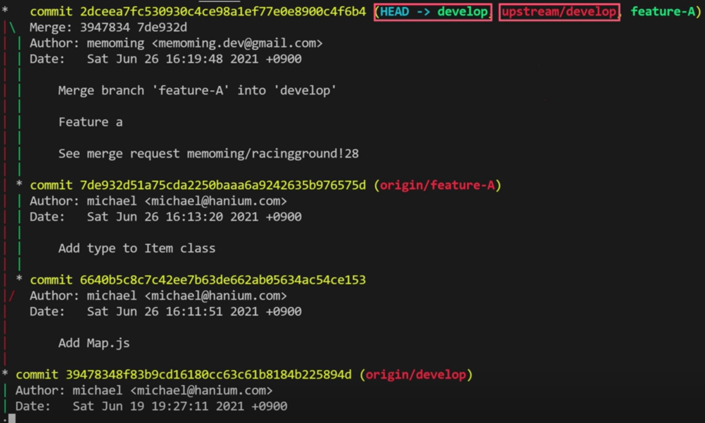 - 이제 내 컴퓨터의 feature-B 브랜치와 원본 프로젝트의 develop브랜치가 같아진 상태가 된다. 따라서