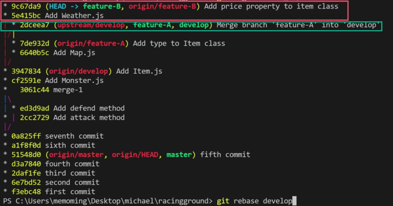 빨간 박스와 초록 박스(develop이후 갈라진 두 커밋들) 현재 develop브랜치 이후에 커밋을 부치려고 함.
