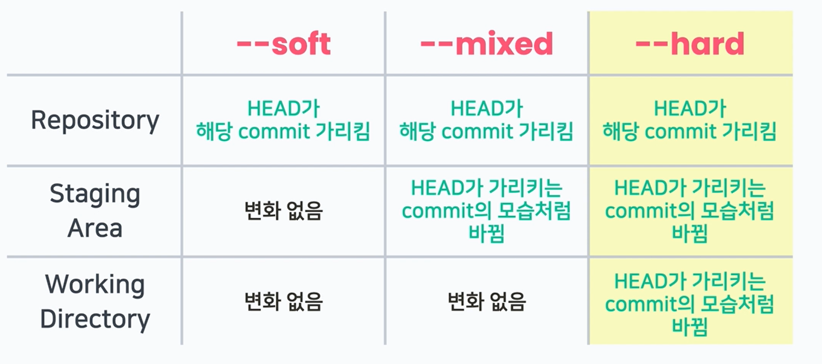 - --soft는 워킹 디렉터리가 잘 반영되어있어서, 바로 commit해도 된다. 또는 고치고 add, commit해도 된다.