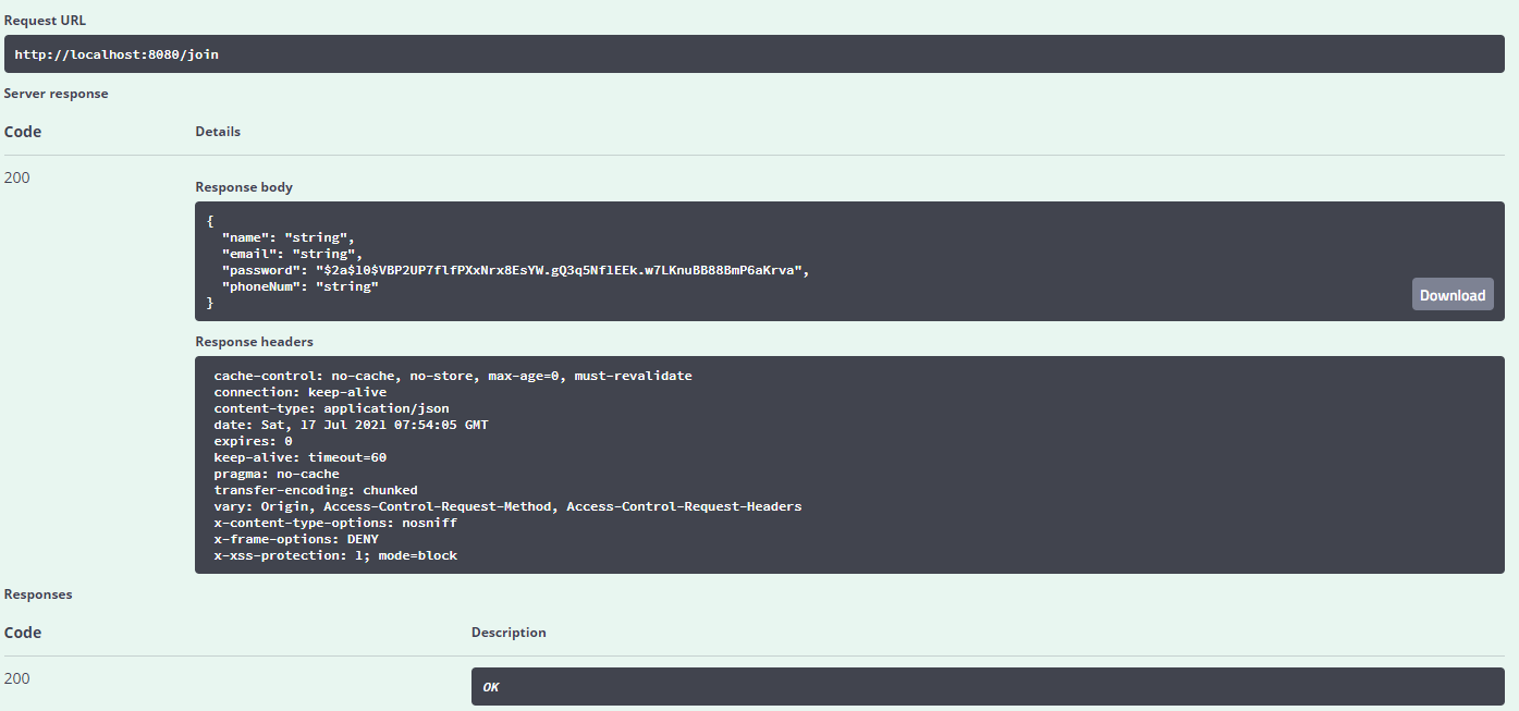 있는 그대로 string으로 다 넣었는데 성공! 패스워드도 인코딩되어서 잘 나온다