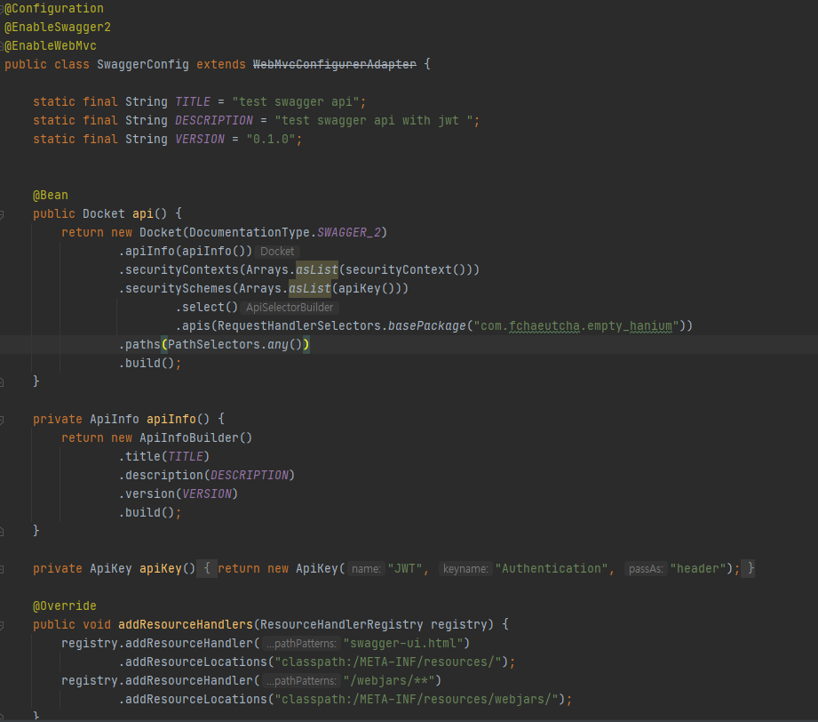 Docket을 생성하여 api정보, jwt를 사용하기 때문에 securityContext, apiKey, 그리고 어느 패키지내에서 이용할 건지, 마지막으로 어떠한 경로를 허용할지를 설정해준다. 테스트를 하기 때문에 PathSelctors.any()로 모든 경로를 열어준다.