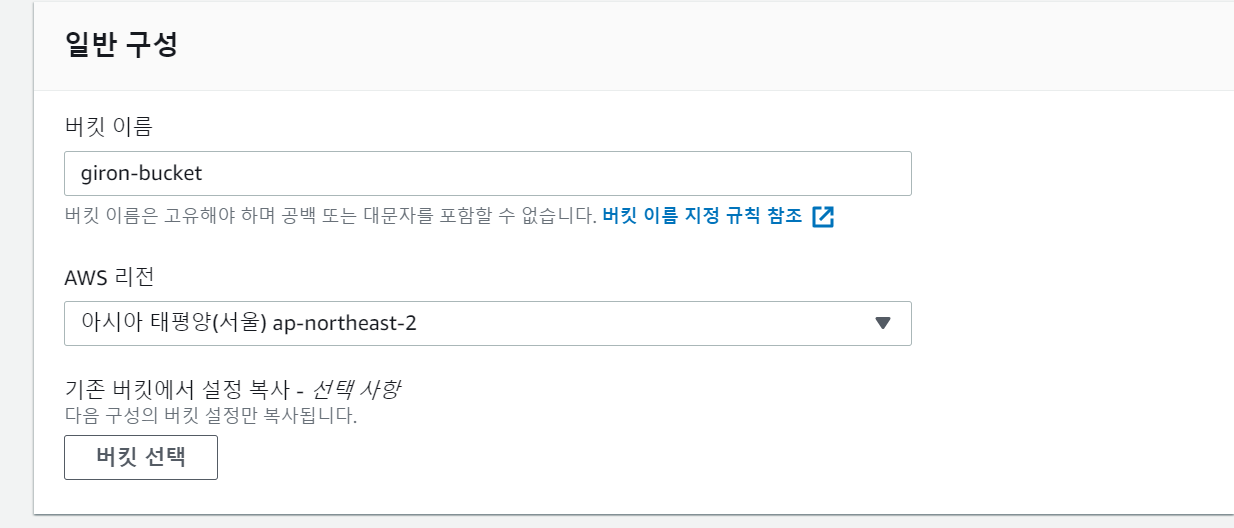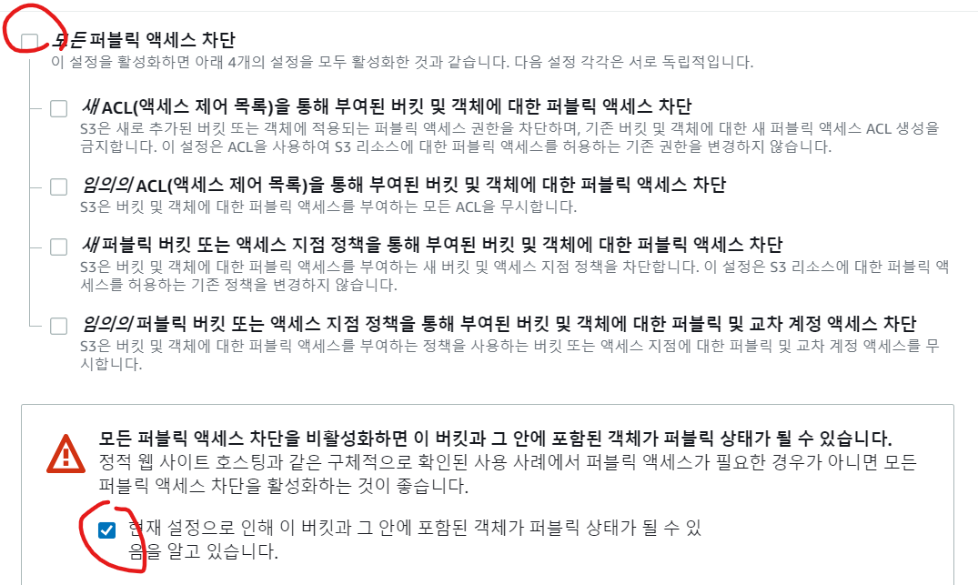 우선 버킷 이름을 설정하고, 모든 퍼블릭 엑세스 차단을 해제해 주고 현재 설정을 확인했다고 체크해줍니다.