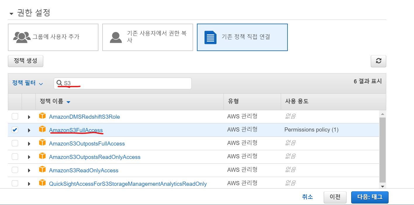 S3에 접근하기 위해서는 IAM 사용자에게 S3 접근 권한을 주고, 그 사용자의 액세스 키, 비밀 엑세스 키를 사용해야 합니다.