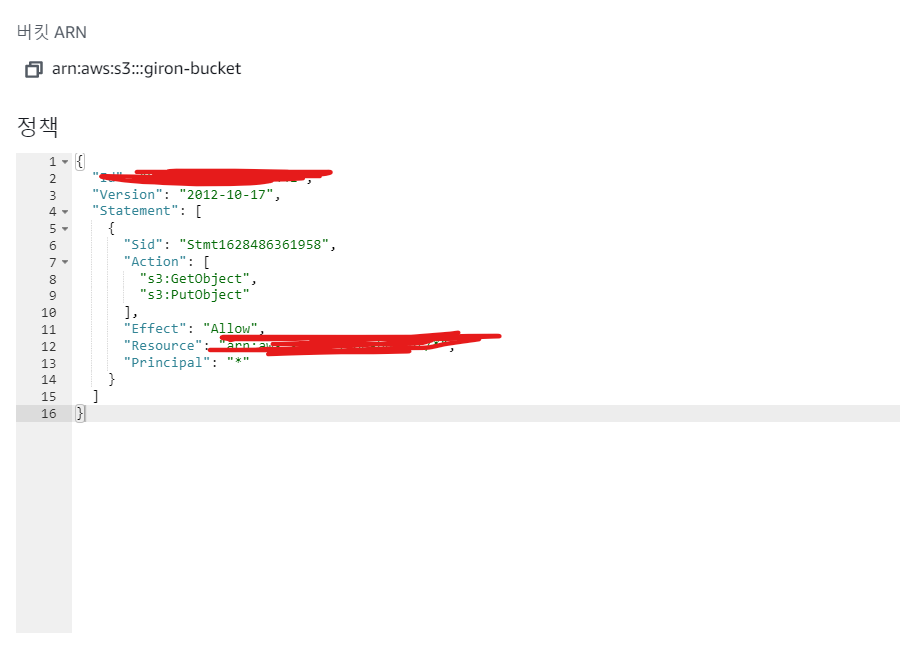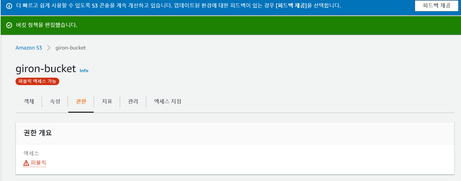 만든 버킷에 들어간 후, 권한으로 한번 더 들어갑니다. 그 후, 버킷 정책의 편집을 눌러줍니다.