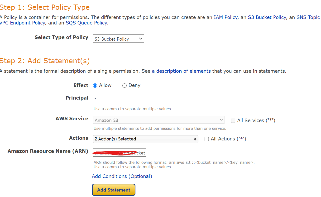 버킷 ARN을 복사해주고 정책 생성기를 눌러줍니다.