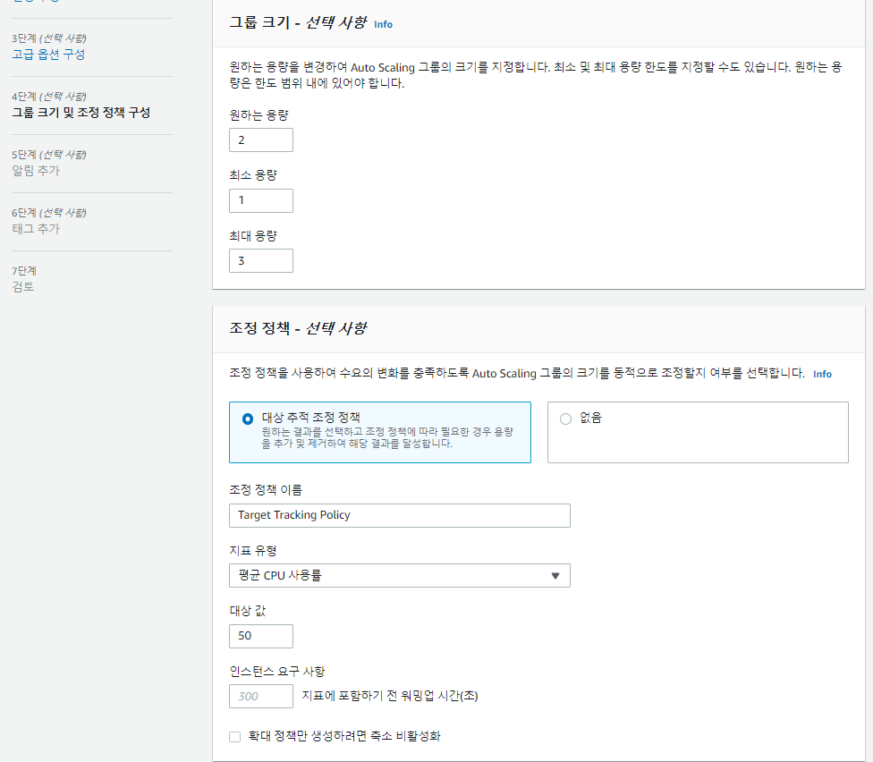 평균 CPU사용량이 50을 넘겼을 때, Auto-Scaling을 합니다.