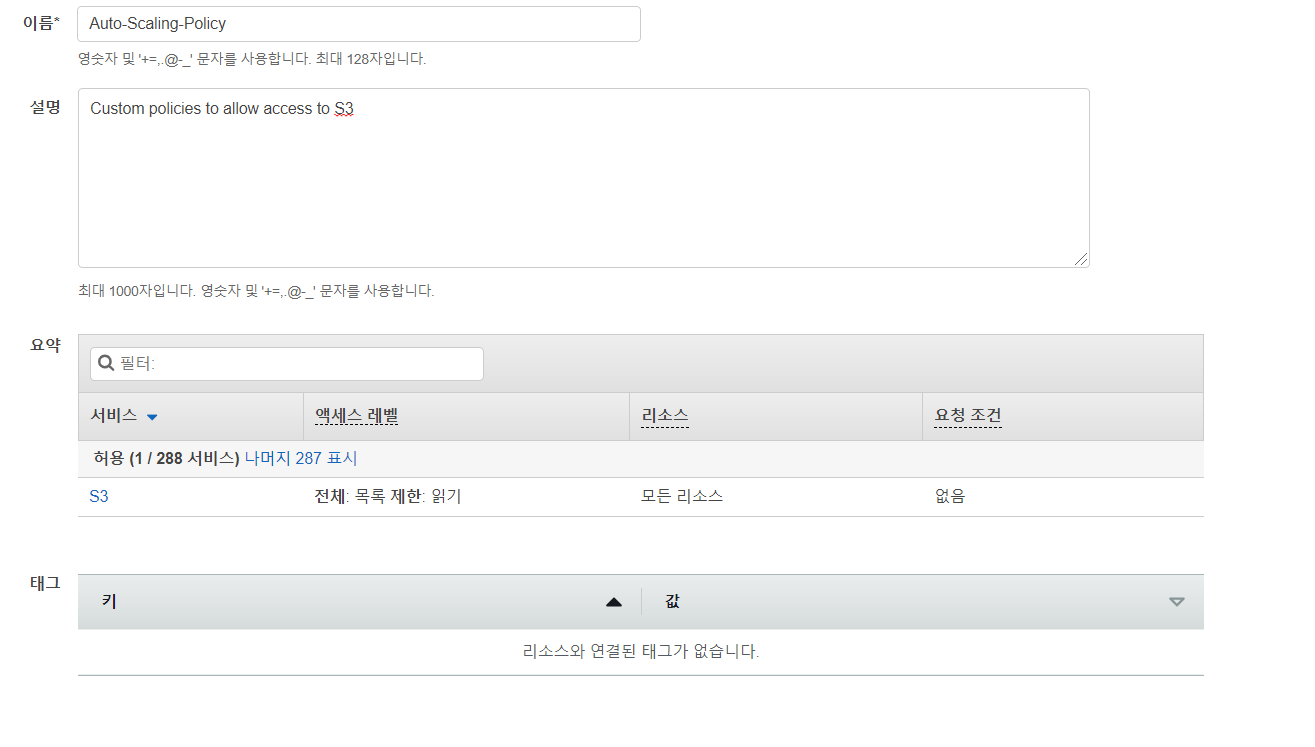 다음과 같이 정책을 입력해줍니다. 설명은 입력 안해도 되는데 하려면 영어로만 가능합니다.