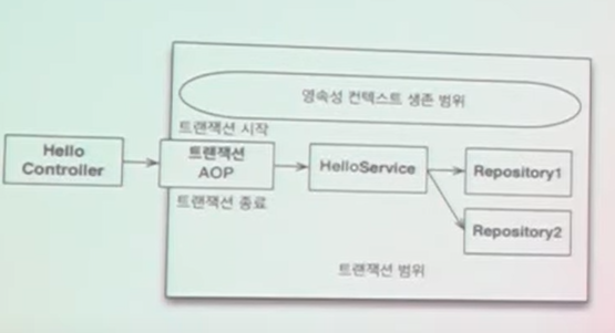 트랜잭션 AOP가 시작하고 끝날 때까지 영속성 컨텍스트 생존 범위의 어디서든 EntityManager에 접근하면 모두 같은 영속성 컨텍스트에 접근한다!