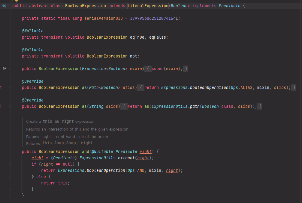 - .and() 로 연결할때 where절의 첫번째 인자에 null이 들어오면 null을 무시 못하고 nullpointerException이 터진다! -> .and()안에 있을때는 또 null을 잘 무시하고 실행 된다.(원래 querydsl은 null이 들어오면 무시하고 넘어가야 함)