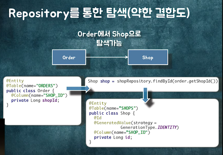 Order에서 Shop을 찾고 싶다면, Order에 shop_id로 ShopRepository를 이용해서 가져오면 된다.