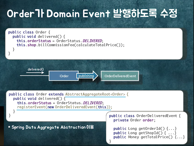 도메인 이벤트 발행 로직을 SpringData에서 제공하는 AbstractAggregateRoot를 상속해준다. 그러면 registerEvent()라는 메서드를 제공받고 거기에 원하는 event를 regist 하면 실제 db에 commit 할 때, 작동한다.