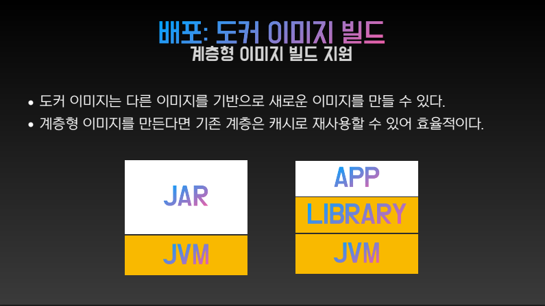 왼쪽의 JVM위에 올라가 있는 fat-jar: 라이브러리까지 만들어져 있는 jar (약 20MB)를 오른쪽처럼 계층으로 나눠준다.