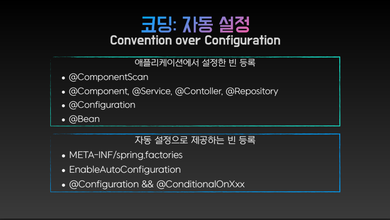 - 또한 자동 설정으로 제공하는 빈끼리도 중복되면 충돌나서 애플리케이션이 뜨지 않는다고 한다.