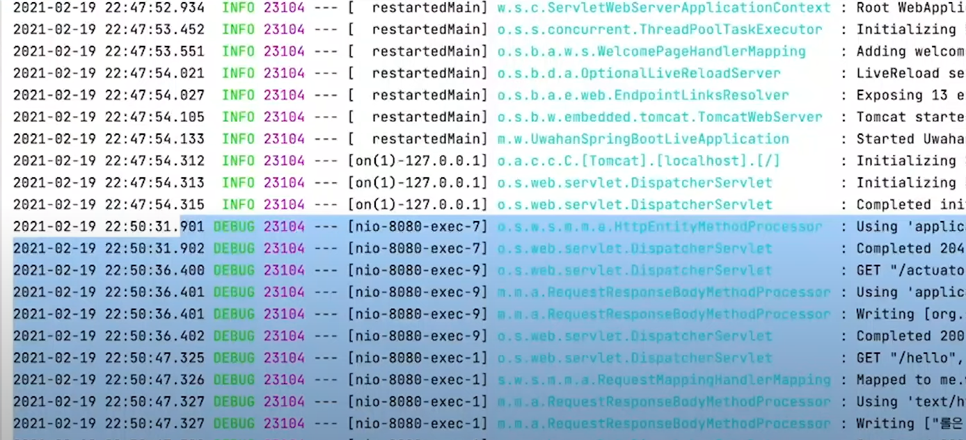 actuator를 통해서 로거의 레벨을 디버그 모드로 바꿀 수 있다.