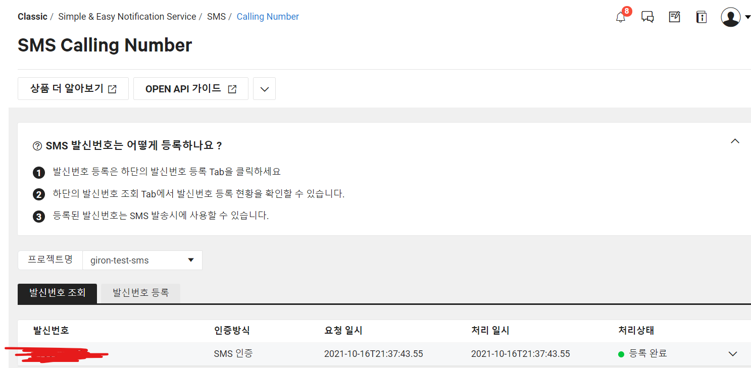발신 번호 등록이 완료되면 위에 처럼 나옵니다! 이후 다시 작업하던 대로(Project-SMS-message) 돌아가 줍니다.