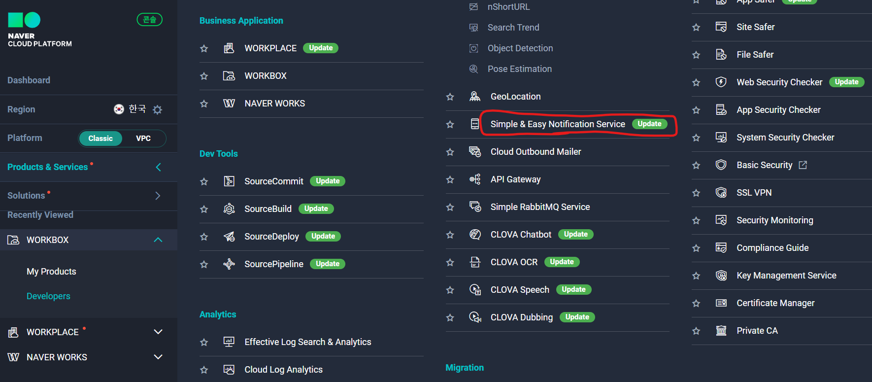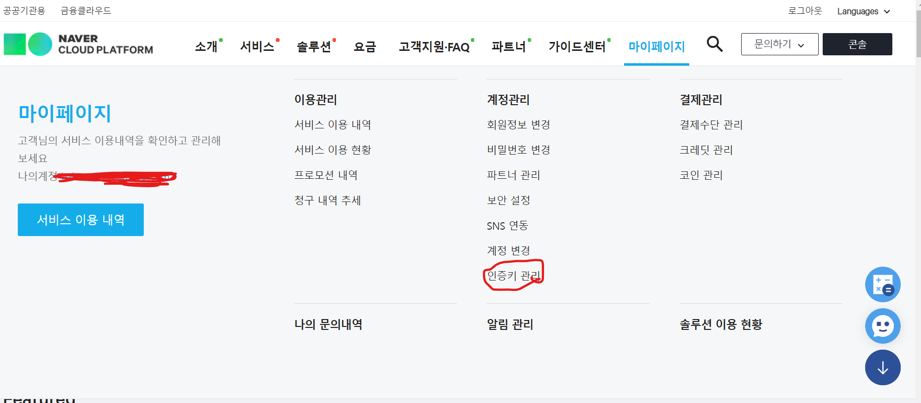 네이버 클라우드에 우선 가입을 해주고 콘솔에서 빨간 박스로 들어가 줍니다.