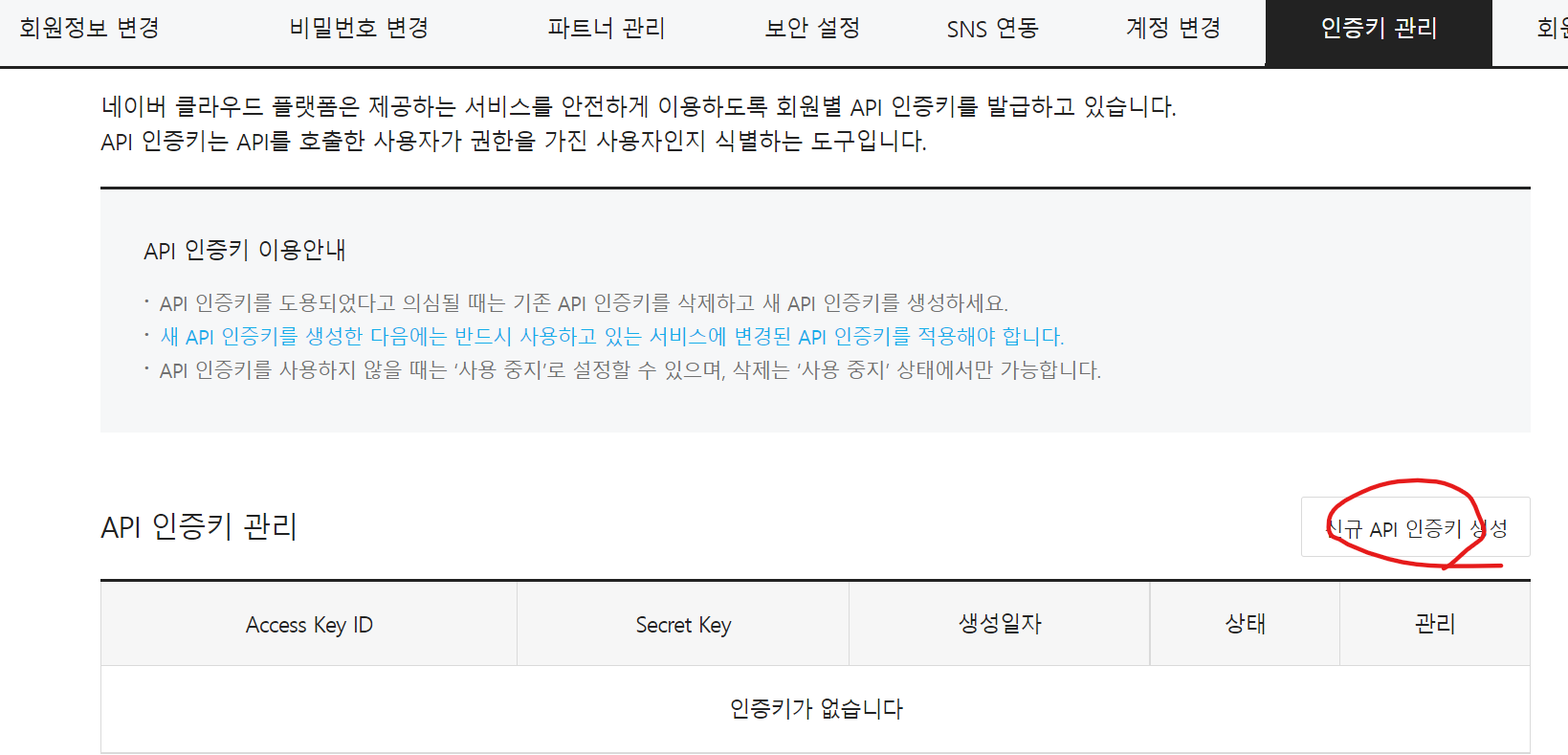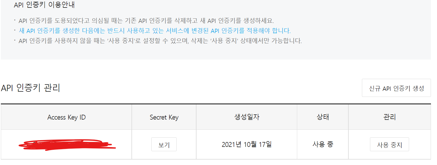 인증키 관리 -> 신규 API 인증키 생성-> 끝