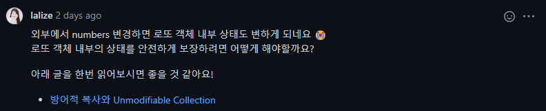 이 상황에선 방어적 복사를 통해 복사본을 반환해도 좋고, Unmodifiable Collection을 이용한 값을 반환하는 것도 좋다.